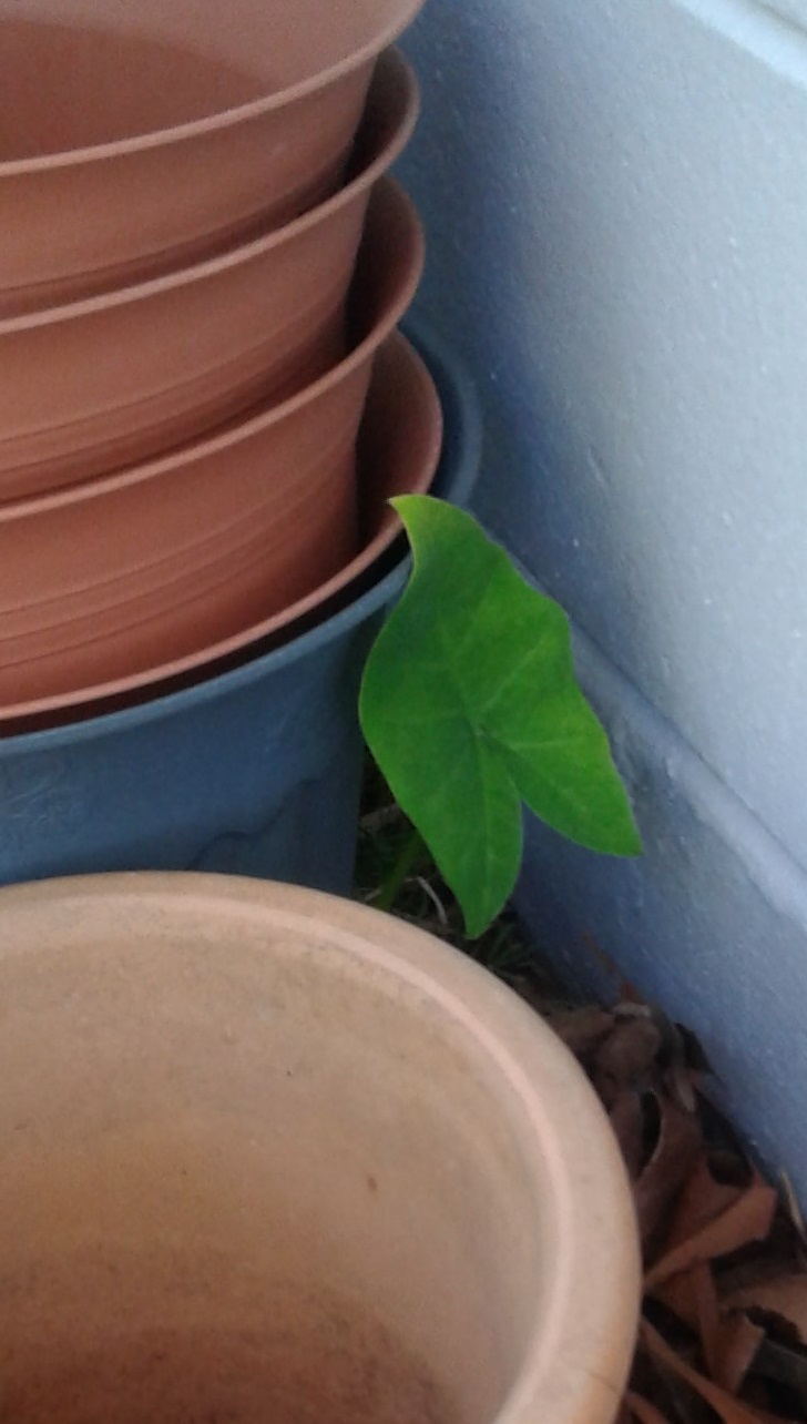 I pulled out the dead leaves yesterday I'll plant these in a large pot or possibly the ground, here is a stray from a spent leaf I tossed last summer peeking out from behind a few empty pots.